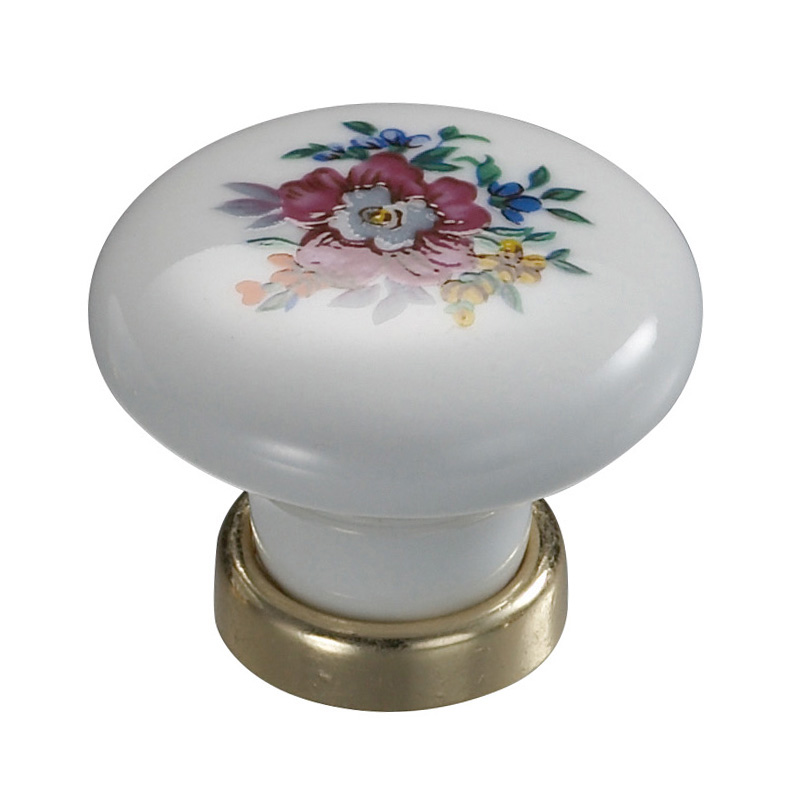 花の装飾を施した磁器と、金色めっきで仕上げた台座を組み合わせたデザイン。アンティークやヴィンテージ、ナチュラルなど質感や風合いの特長的なテイストの家具に最適です。